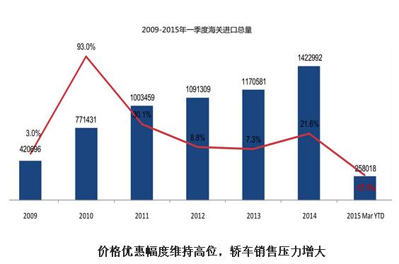 进口量面临深度调整,需求增速明显回落。经 历了2012-2013年的个位数增长之后,2014年市场供给再次加大,全年进口车达到142.2万辆,同比增长21.6%。而2015年一季度,受宏 观经济增速放缓、反腐冲击高消费,以及进口车国产化等因素的影响,进口汽车量同比大幅下滑达17.1%,进口汽车市场增速回归理性。进口汽车市场销售上牌 31.8万辆,同比下滑5.8%。同时,在高库存压力下,进口汽车市场供给也开始出现调整态势。